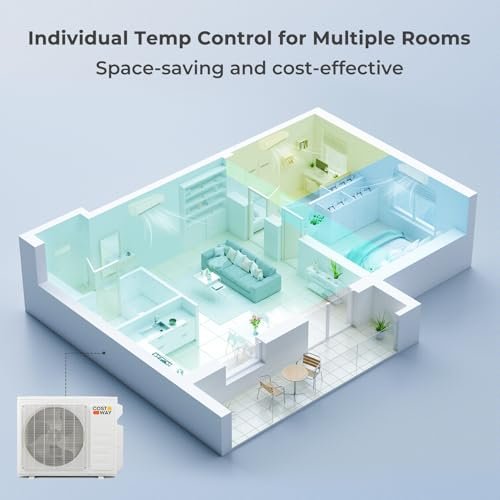 Experience year-round comfort with the COSTWAY 27K BTU Tri-Zone Mini Split. This WiFi-enabled system cools and heats three separate areas efficiently with its 19 SEER2 rating. Control via smartphone or Alexa for ultimate convenience and energy savings.