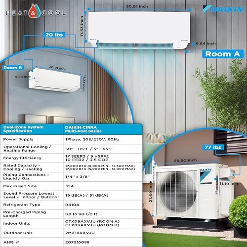 Experience year-round comfort with Daikin’s 2-Zone CIRRA Mini Split System. Efficiently heat and cool separate spaces with dual 9,000 BTU units, complete with Maxwell installation kit and wall brackets for easy setup. Energy-efficient climate control at your fingertips.