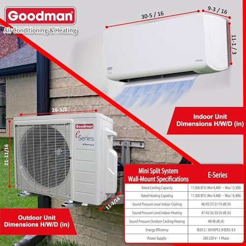Upgrade with the Goodman 12,000 BTU mini split. This 18 SEER2 ductless mini split system features inverter technology, quiet operation, and energy-efficient heating and cooling. It includes a Maxwell 16-ft installation kit and wall bracket for easy setup. Perfect single zone mini split for small spaces, basements, or garages. Choose the reliable Goodman e-Series for high efficiency and cost-effectiveness.