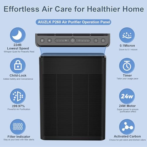 Breathe easier with the AIUZLK Air Purifier’s powerful 24W motor and H13 HEPA filtration that captures 99.97% of particles down to 0.1 microns. Whisper-quiet at 22dB, it effectively cleans spaces up to 2000 sqft, eliminating pet dander, smoke and wildfire pollutants.