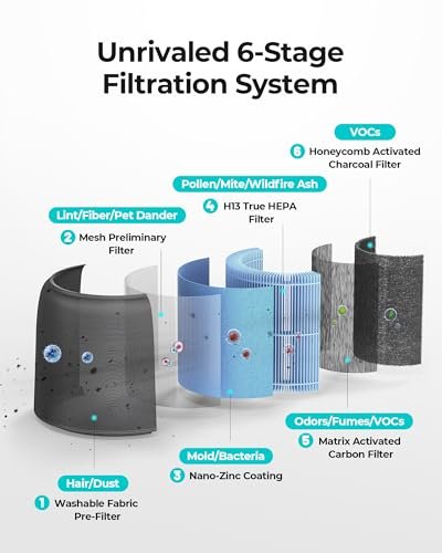 While no air purifier can eliminate all indoor air pollutants, the Homvana’s 6-stage filtration system tackles an impressive range of contaminants. The combination of effective performance, quiet operation, and user-friendly features