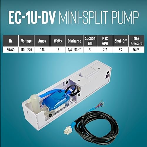 Compact, powerful mini-split condensate pump with automatic operation, 2.5 GPH flow rate, and universal voltage compatibility. Perfect for efficient HVAC condensate management in residential and commercial spaces.
