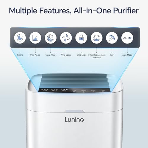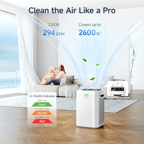Breathe easier with the LUNINO Air Purifier’s double-sided HEPA filtration, cleaning spaces up to 2600 ft². Smart WiFi control, real-time air quality monitoring, and washable pre-filter tackle pet hair, dust, and allergens efficiently in any large room.
