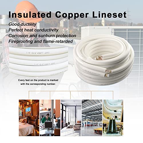Premium 50ft copper line set with insulated 1/4″ & 3/8″ pipes, ready for quick HVAC installation. Features thickened 3/8″ PE insulation and pre-attached nuts for leak-free connections. Perfect for mini-split AC systems and refrigeration equipment.